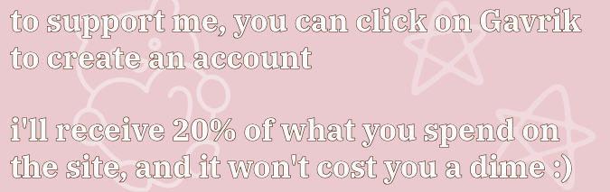 if you'd like to support me, you can create an account by clicking on Gavrik. i'll receive 20% of what you spend on the site, and it won't cost you a dime :)